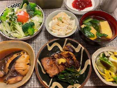 ブリの照り焼き、野菜サラダ、梅じゃこ冷奴、キャロットラペ、白菜の昆布漬け、小松菜とお揚げのお汁、温泉玉子、鶏手羽元と玉ねぎの煮込み、ほうれん草の胡麻和え。デザートにみかんと、イチゴヨーグルト。