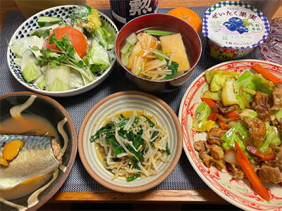 鯖の味噌煮、野菜サラダ、小松菜とエノキタケとお揚げのお汁、豚肉と野菜の炒めもの、ニラとモヤシのカレー風味胡麻和え。デザートにみかんと、ブルーベリーヨーグルト(半額)。