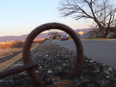 堤防沿いの金具越しに覗いたら望遠鏡みたいで面白いかなと思って撮ってみましたが、まァ期待以上でも以下でもありませんでした。