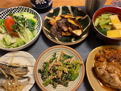 いわしの梅煮、野菜サラダ、椎茸のバター醤油炒め、小松菜とエノキタケとお揚げのお汁、鶏肉のトマトソース煮、ほうれん草の胡麻和え。デザートにりんご。