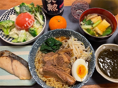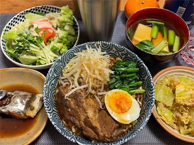 ブリの煮付け、野菜サラダ、ちりめんじゃこポン酢の冷奴、小松菜とお揚げの味噌汁、白菜の昆布漬け、自家製ラーメン。デザートにみかんと、フォンダンショコラ。