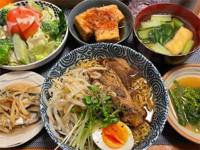 いわしの梅煮、野菜サラダ、キャベツの胡麻和え、小松菜とお揚げのお汁、自家製ラーメン。デザートにヨーグルト。