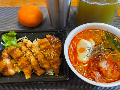 翌日はスーパーのカツ丼(299円)と、カップラーメン。
