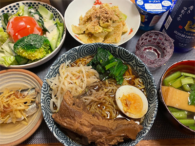 いわしの煮付け、野菜サラダ、焼きピーマンのおかかポン酢、キムチ冷奴、小松菜とお揚げのお汁、もずく酢、ほうれん草の胡麻和え、自家製ラーメン。デザートにクリームプリン。
