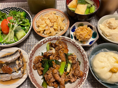 ほっけの塩焼き、野菜サラダ、明太子冷奴、小松菜のかきたま汁、豚肉とピーマンとジャガイモの中華炒め、白菜の昆布漬け。デザートにみかんと、シュトーレン。