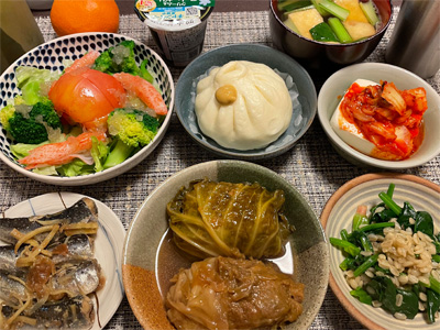 イワシの梅煮、野菜サラダ&カニカマ、豚まん、小松菜とお揚げのお汁、キムチ冷奴、ほうれん草ともち麦の和え物、ロールキャベツ。デザートにみかんと、コーヒーゼリー。