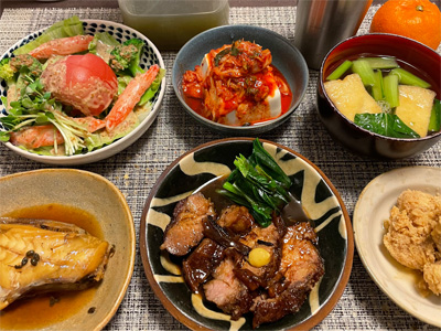 カワハギの煮付け、野菜サラダ、キムチ冷奴、小松菜とお揚げのお汁、タラの子の煮付け、焼き豚&付け合わせのほうれん草。デザートにみかんと、シュークリーム。