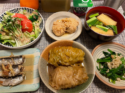 イワシの梅煮、野菜サラダ、タラの子の煮付け、小松菜とお揚げのお汁、ほうれん草ともち麦のお浸し、ロールキャベツ。デザートにみかんと、ぶどうヨーグルト。