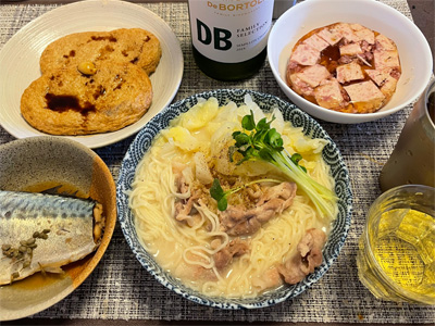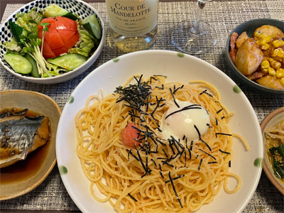 翌日は鰆の山椒煮、野菜サラダ、たらこスパゲティ、ジャガイモの総菜、もやしとほうれん草の胡麻和えで、白ワイン1本。