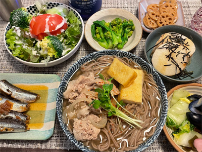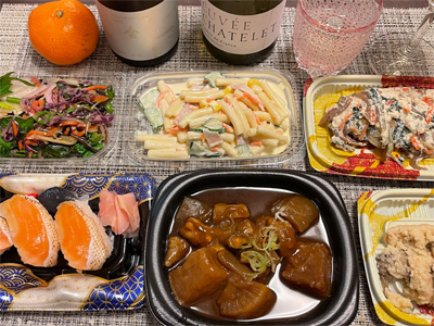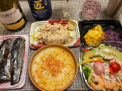 夕食はどこの居酒屋も忘年会シーズンで混んでいるので、スーパーの総菜を買い込んで自宅飲み。サーモン寿司、野菜サラダ、マカロニサラダ、白和え、おから、土手煮込みで白ワインと日本酒。