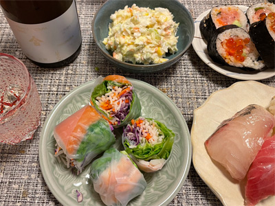 というわけで、この日の夕食はロピアで買って帰った生春巻きとコールスロー、海鮮巻き、握りずし(しまあじ、まぐろの脳天、つぶ貝)で日本酒。