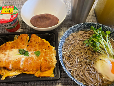 翌日はスーパーのカツ丼(最近の気に入り。299円とリーズナブル)、焼きいも、蕎麦、半額のアロエヨーグルト。