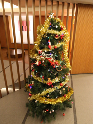 クリスマスイブということで、住んでいる集合住宅の管理人さんがエントランスにクリスマスツリーを飾ってくださってます。