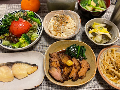 ブリの照り焼き、野菜サラダ、梅じゃこ冷奴、キャロットラペ、白菜の昆布漬け、小松菜とお揚げのお汁、温泉玉子、鶏手羽元と玉ねぎの煮込み、ほうれん草の胡麻和え。デザートにみかんと、イチゴヨーグルト。