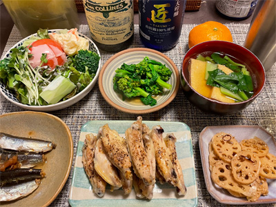 イワシの梅煮、野菜サラダ、菜の花のワサビ和え、小松菜とお揚げのお汁、蓮根のきんぴら、鶏手羽中焼き。で、白ワインと日本酒。デザートにクリームどら焼き。