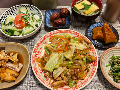 ほっけの塩焼き、野菜サラダ、明太子冷奴、小松菜のかきたま汁、豚肉とピーマンとジャガイモの中華炒め、白菜の昆布漬け。デザートにみかんと、シュトーレン。