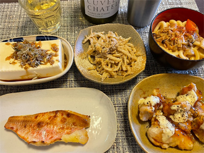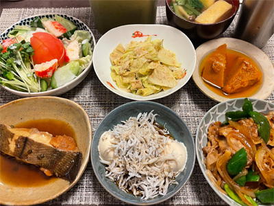 銀鮭の西京焼き、野菜サラダ、キムチ冷奴、小松菜のかきたま汁、鶏手羽元と玉ねぎの煮込み、じゃがバター明太子&ほうれん草。デザートにタカナシのヨーグルト。
