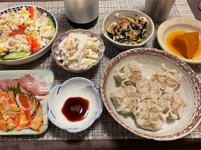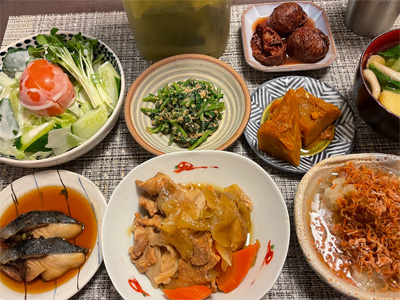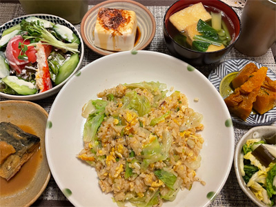 サバの味噌煮、野菜サラダ、冷奴、小松菜とお揚げのお汁、カボチャ煮、白菜の昆布漬け、レタスのチャーハン。デザートにクレープ。