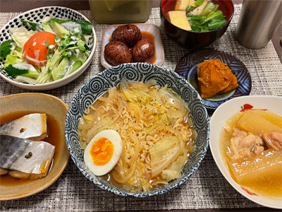 鰆の煮つけ、野菜サラダ、栗の渋皮煮、小松菜としめじとお揚げのお汁、カボチャ煮、鶏と大根のあんかけ煮、即席ラーメン(+玉ねぎ、キャベツ、ゆでたまご)。デザートにブルーベリーヨーグルト。