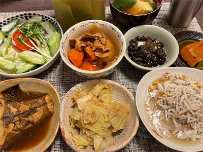 カレイの煮つけ、野菜サラダ、豚じゃが、小松菜としめじとお揚げのお汁、黒豆納豆の巣ごもり玉子、カボチャ煮、大根おろしポン酢&釜揚げしらす、キャベツのごま和え。デザートにチチヤスヨーグルト。