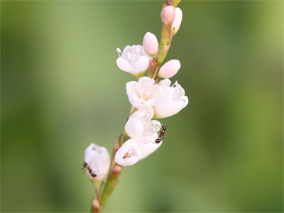 翌日は写真撮りがてらブラブラ近所を散歩。アリが頑張って花に登っておられました(花はシロバナサクラタデとグーグル先生からのご教示)。