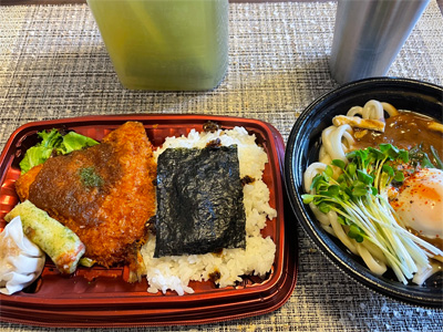 翌日はスーパーのアジフライのり弁とカレーうどんで昼ごはん。