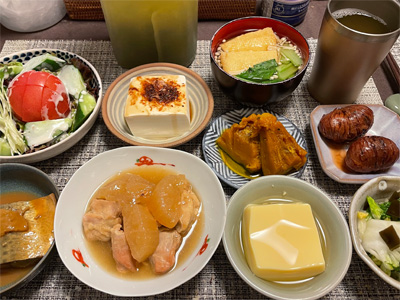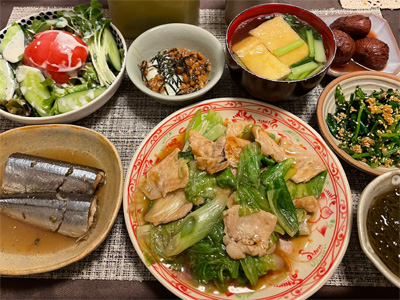サバの味噌煮、野菜サラダ、冷奴、小松菜とお揚げのお汁、カボチャ煮、栗の渋皮煮、白菜の昆布漬け、玉子豆腐、鶏大根。デザートにヨーグルト。
