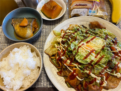 朝昼兼用は、白ご飯、サバの味噌煮、カボチャ煮、焼きそば。ホイップどら焼きも食べました。