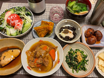 ブリの煮つけ、野菜サラダ、カボチャ煮、黒豆納豆の巣ごもり玉子、小松菜とお揚げのお汁、栗の渋皮煮、大根皮の浅漬け、ほうれん草の胡麻和え、豚じゃが。デザートにシュークリーム。