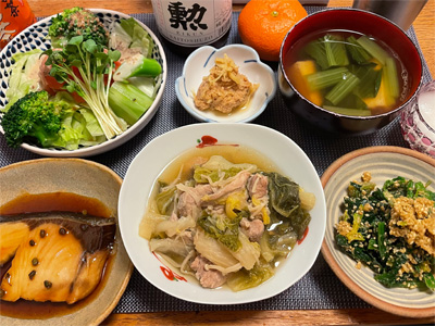 ぶりの煮付け、野菜サラダ、たらこの煮付け、小松菜とお揚げのお汁、ほうれん草の胡麻和え、豚肉と白菜の煮物。デザートにみかんと、プリンケーキ。
