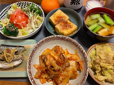 塩さば焼き、野菜サラダ、キムチ冷奴、小松菜とお揚げのお汁、大根皮のポン酢漬け、キャベツの胡麻和え、豚肉と白菜とエノキタケの煮物。デザートにミカンと、りんご。